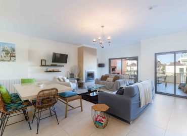 The spacious living and dining room includes a television with MEO channels and fiber-optic internet, making it easy to unwind after a day of exploring. The dining table comfortably seats 8 people, perfect for family meals or gatherings.